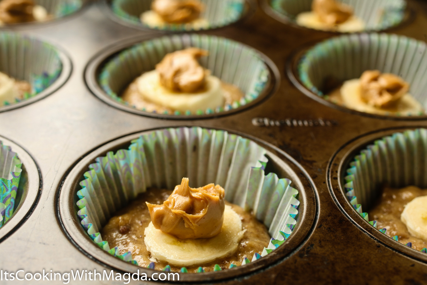 Prepare the muffin pan. Fill each muffin cup half way up with the batter, then place one slice of banana in the center and add a good teaspoon or two of the peanut butter. Cover with more batter.