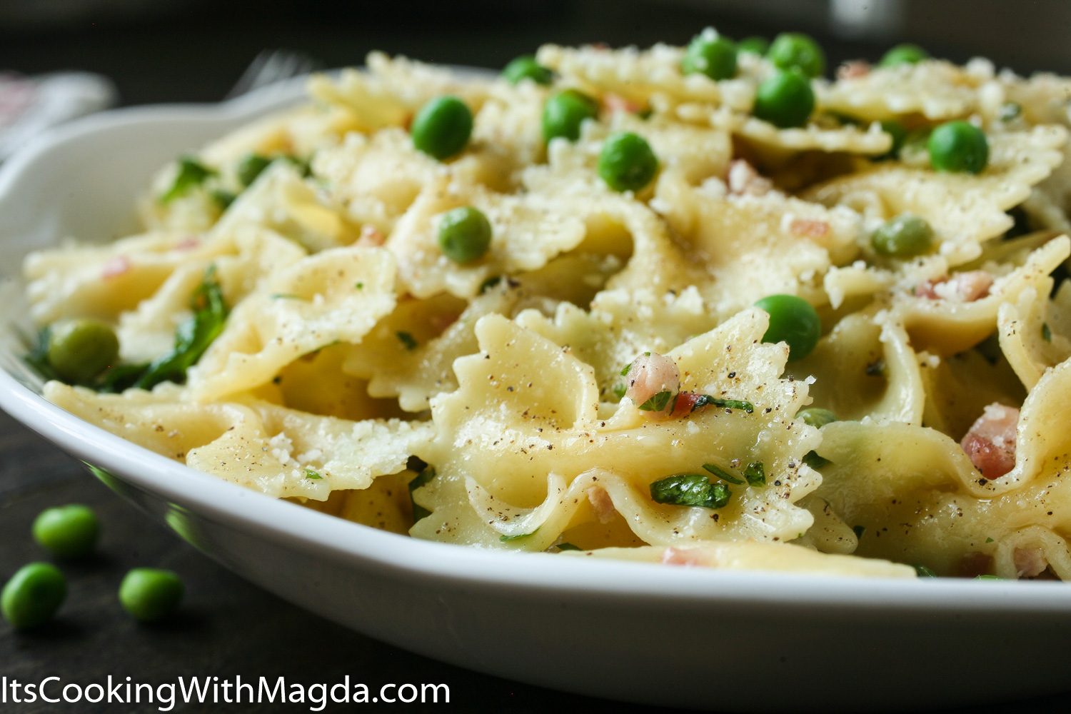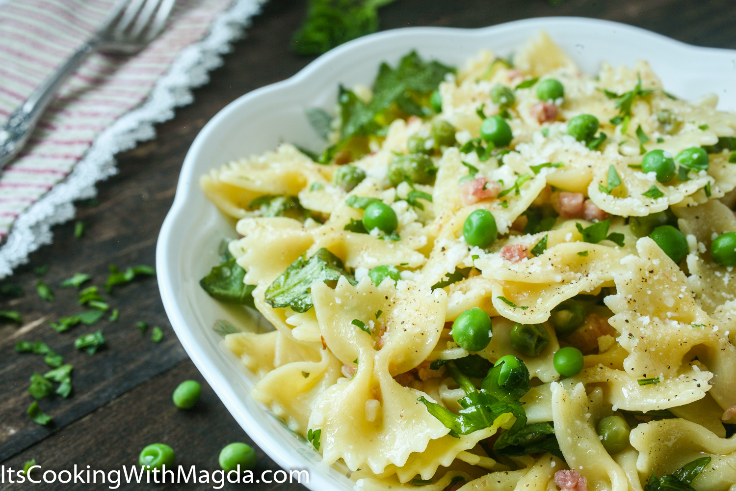 To make my Farfalle with Peas and Pancetta start by bringing a large pot of water to boil so you can cook the pasta. In the meantime, cook pancetta in a bit of olive oil, then add a sliced garlic and pour some broth or white wine onto the skillet. Let it simmer for 4-5 minutes. When the pasta is almost done, I like to add frozen peas into the pot instead of frying them on a skillet. This way the color stays a bit more vibrant. If you are using fresh peas you might have to precook them separately since they cook a bit longer. Add them to the skillet with the cooked pasta. Stir really well, add generous serving of grated Parmesan cheese and pepper. Drizzle with some olive oil and mix in 2-3 handfuls of arugula. Sprinkle with chopped fresh parsley. Serve.