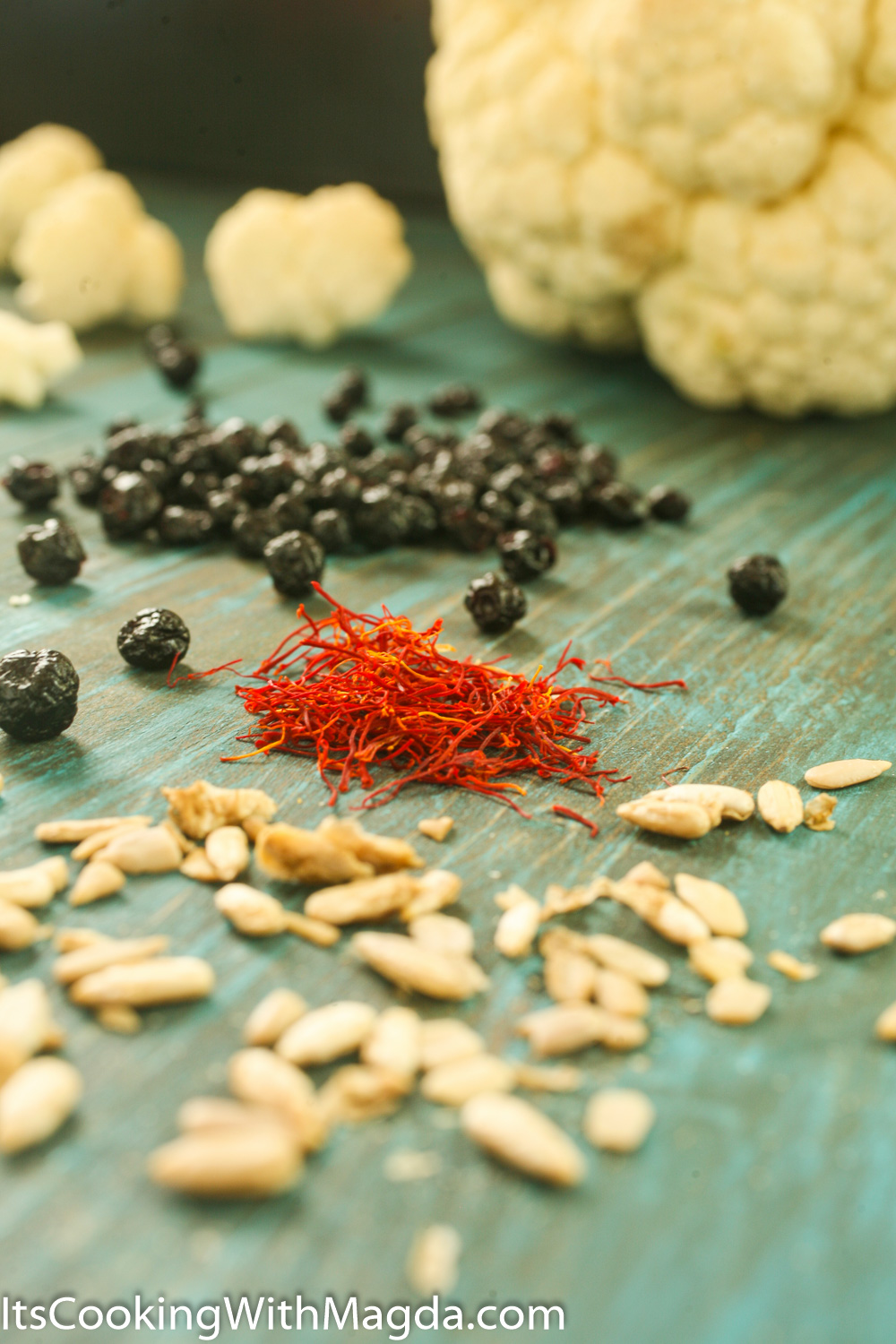 Start preparing this dish by bringing a large pot of water to boil. Meantime, separate the cauliflower into smaller florets. You want them to be a bite size. Put them into the pot and add salt. Cook for about 5 minutes, until slightly soft but still undercooked. Dice 1 onion and add it onto a hot skillet with some olive oil. Using a slotted spoon, transfer the cooked cauliflower florets into a skillet. Reserve the cooking water to cook the pasta in it. Place about 1/4 cup of the hot water into a small bowl and add a pinch of ground saffron threads. Let them soak for about 10-15 minutes. Add more water to the pot if needed, bring to a boil and add pasta.