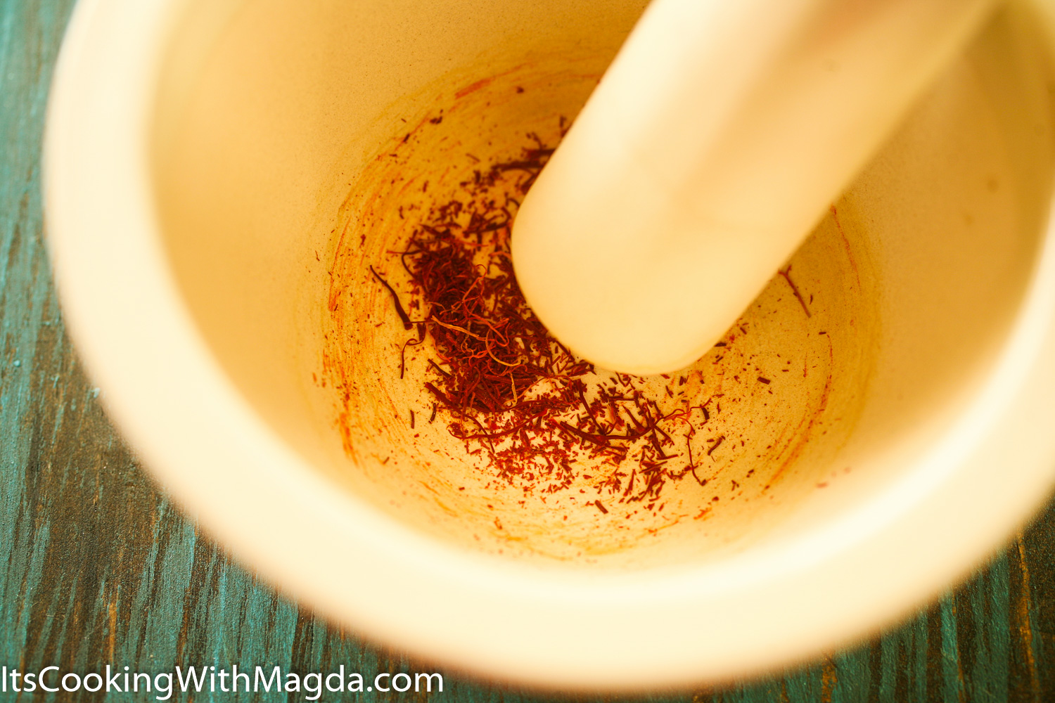 It is good to grind the saffron threads in a mortar and soak them in hot water for 15 minutes before adding the orange colored water into a dish.