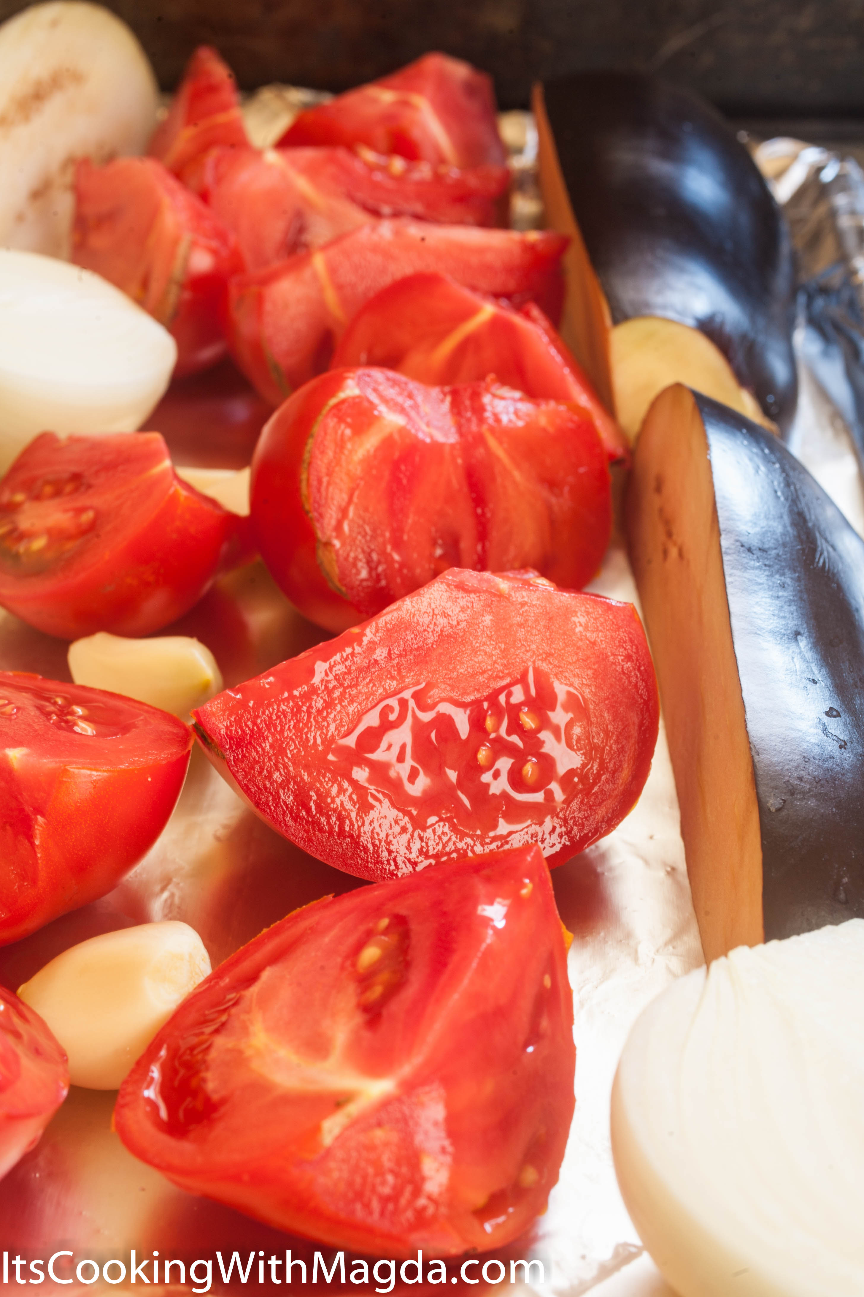 In this recipe you need to roast quartered eggplant, halved tomatoes (or quartered if big), onion and several garlic cloves. Make sure to brush some olive oil onto the vegetables. Roast at 425 degrees for about 45 minutes until brown spots appear.