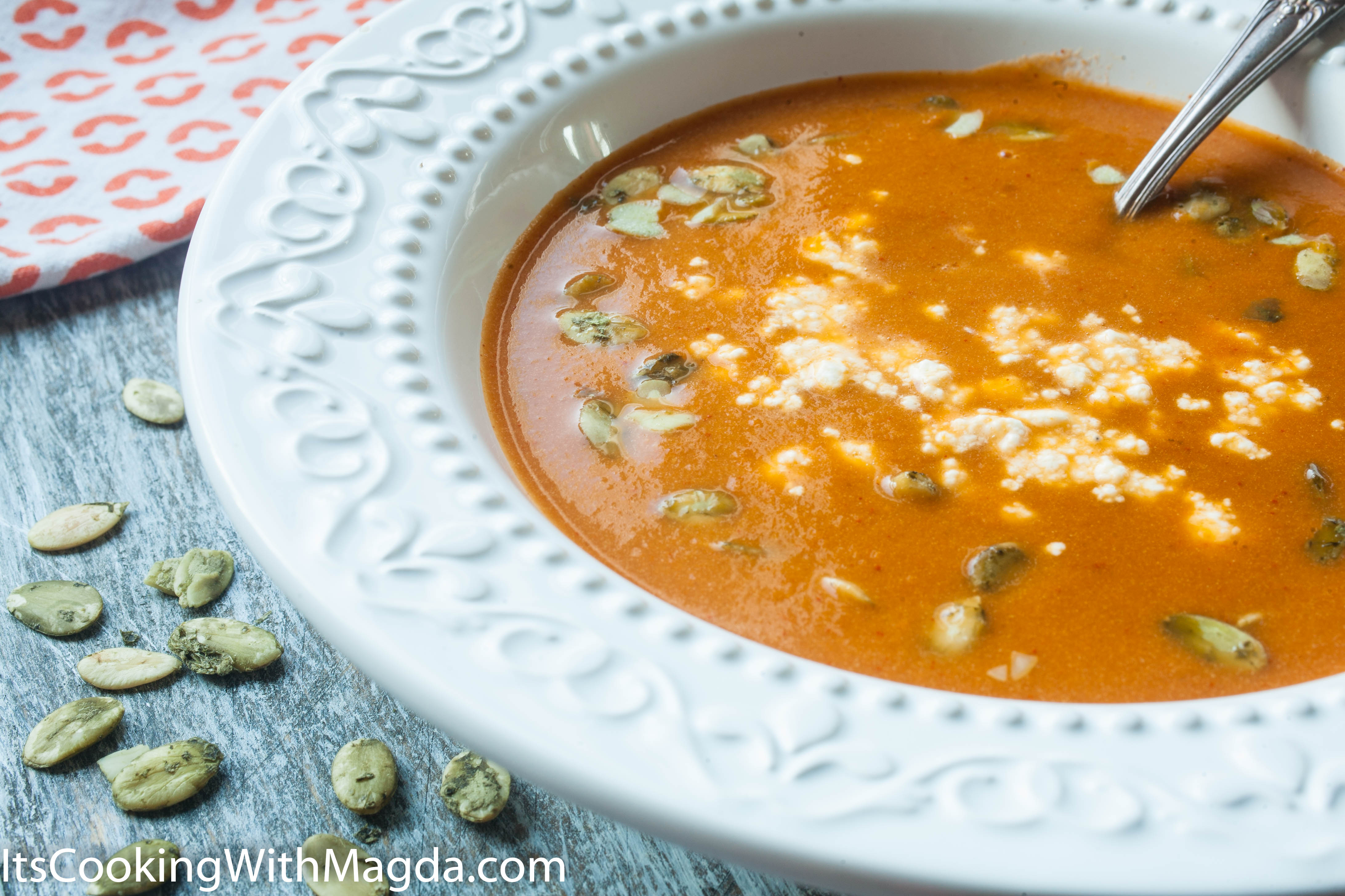 Today’s recipe is one of my favorite soup recipes. I make it only during the summer months when tomatoes are bursting with flavor and so many heirloom varieties are available. The riper the better. There are only few steps required: roasting the vegetables, cooking them in a veggie/chicken broth and pureeing everything. Then return your soup to a pot, add cream (if using) and serve.