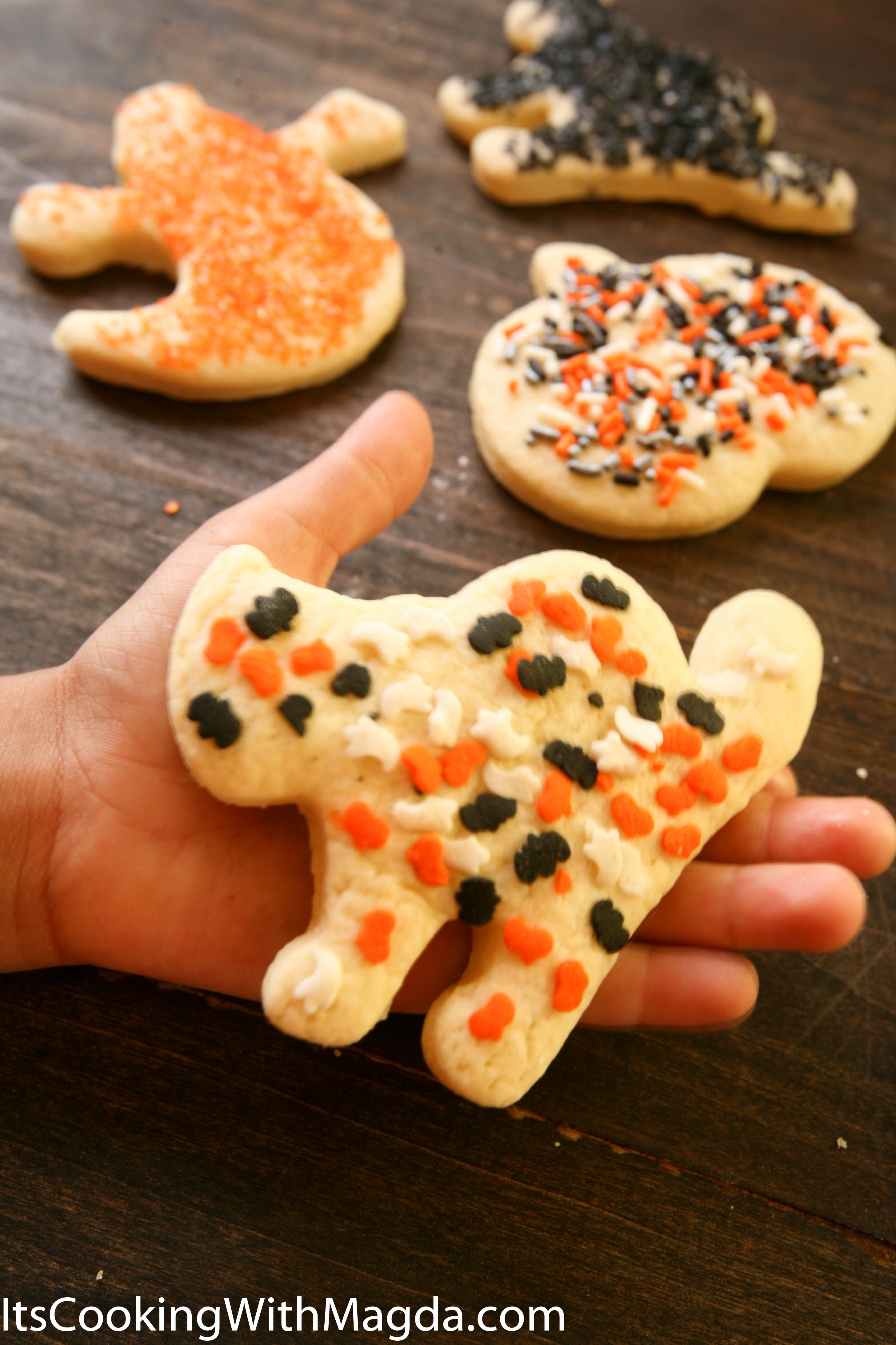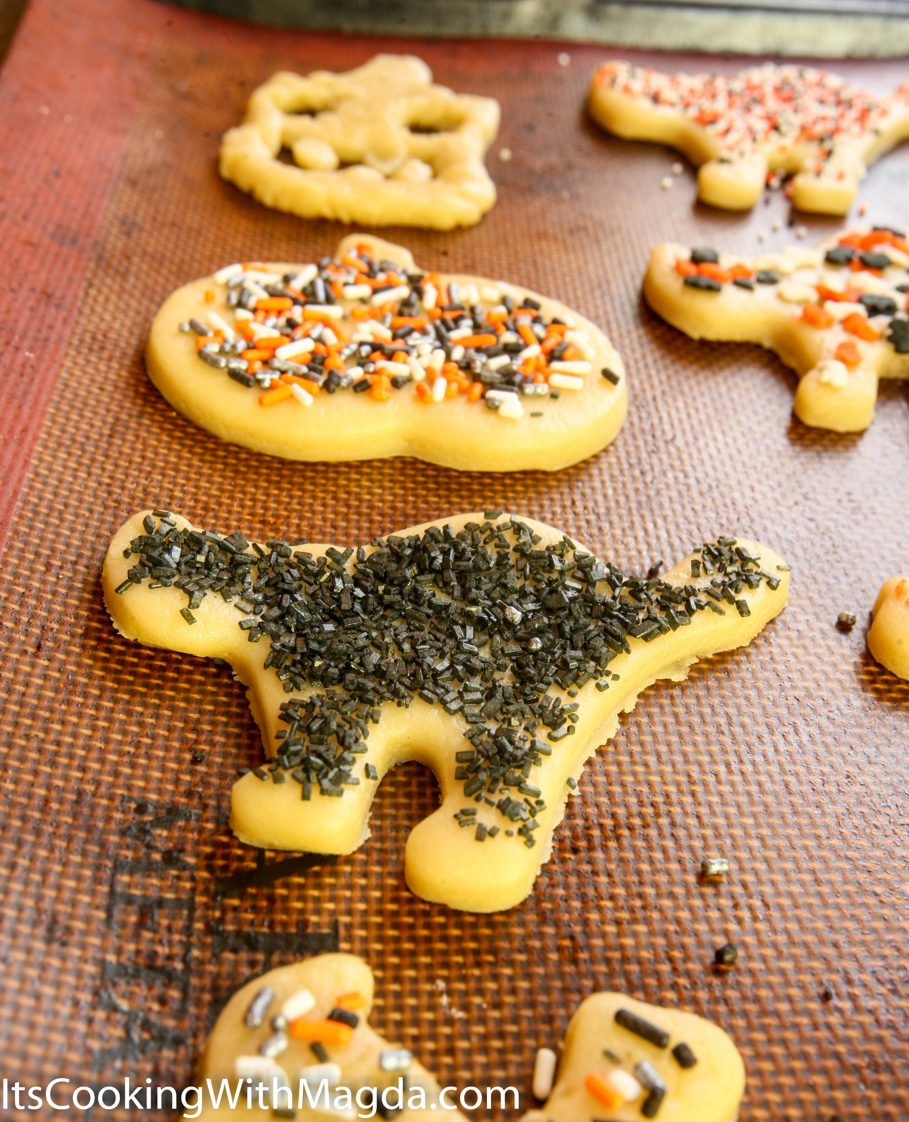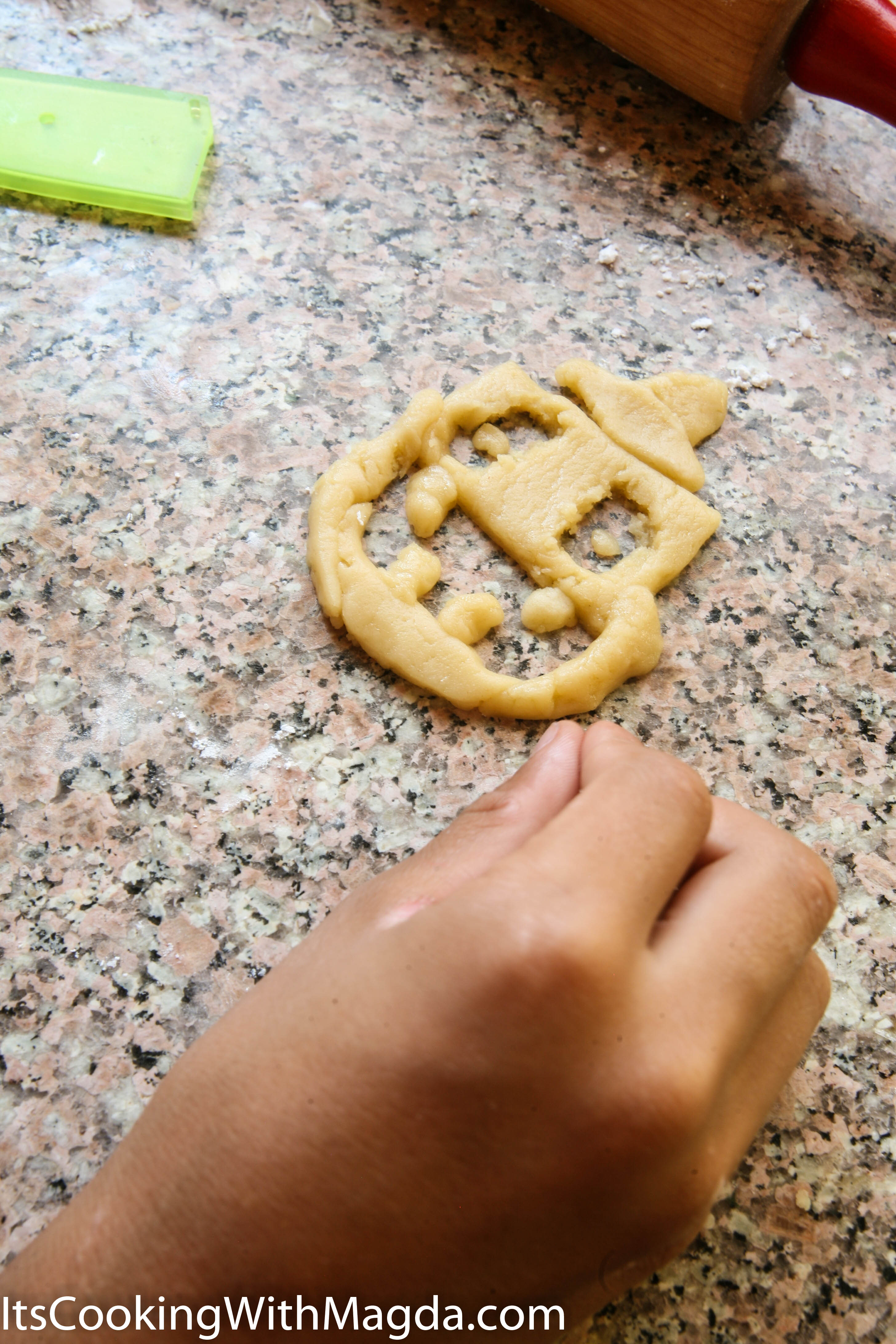 halloween roll out cookiesBake the cookies for 8-10 minutes at 375 degrees until very lightly colored on the edges. Cool them for 5 minutes then transfer onto a cooling rack. Continue with the remaining cookie dough. Make sure the baking pan has cooled down  before placing another batch of cookies to bake.