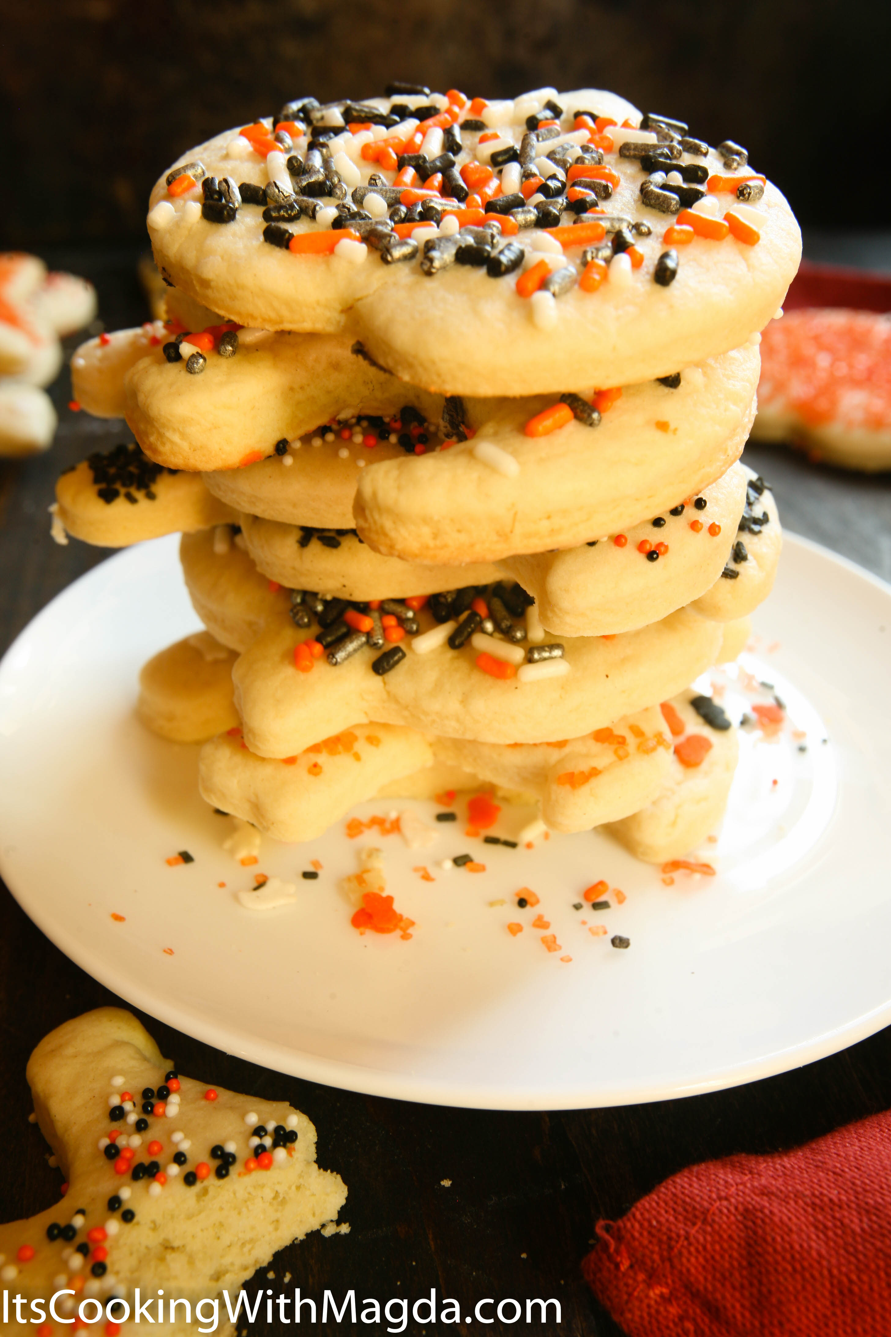 Here is one of my go-to cookie dough recipes. The cookies have crunchy edges and soft centers. Great for decorating!A stack of Halloween cookies decorated with sprinklesCookies are always in season, at least in our house, but this time of year they are even more popular and requested. I read recently that making cookies is almost a thing of the past, something our grandmas did when we were little. I do remember helping my Grandma cut out circles out of dough using a cup because cookie cutters were not available at first. She always worked by the window where the long counter was (well, it seemed long then, not so much now). She would roll out the dough on a wooden board that was probably half the size of the counter space. I don’t remember where she kept it. The wooden board was used only for rolling the dough, which happened several times a week since my Grandma always made a fresh pasta for her chicken soup or dumplings.